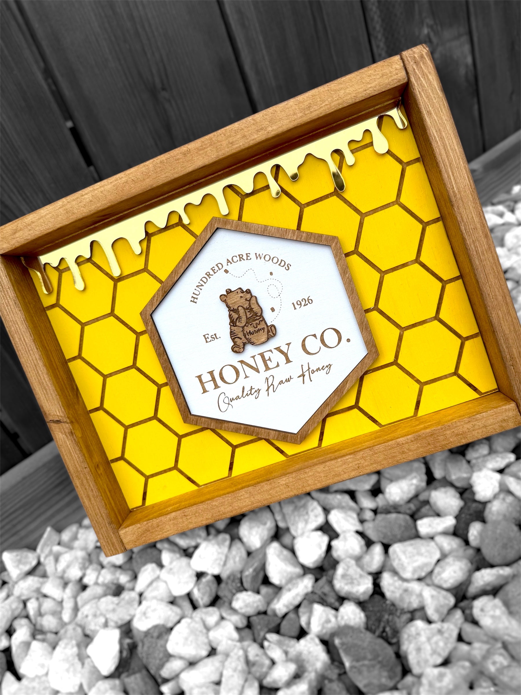 Our honey comb sign featuring a gold acrylic.